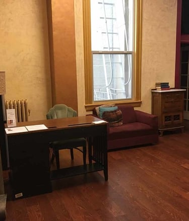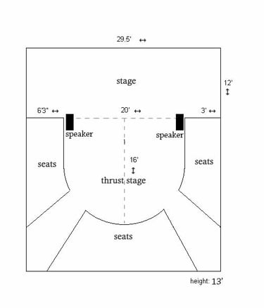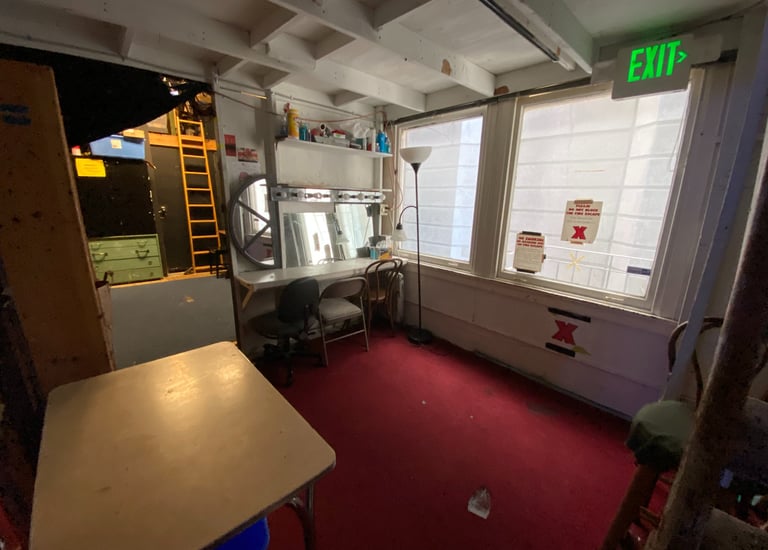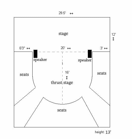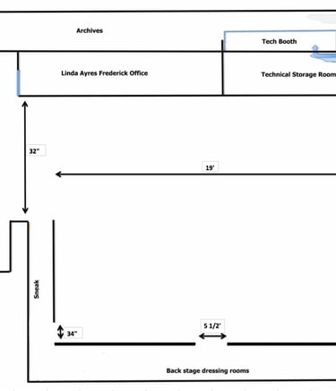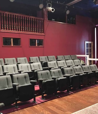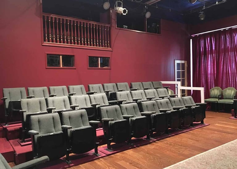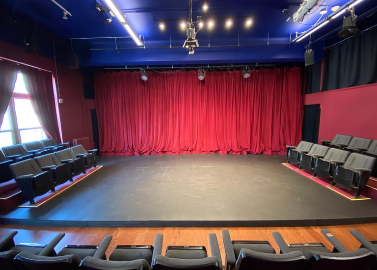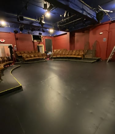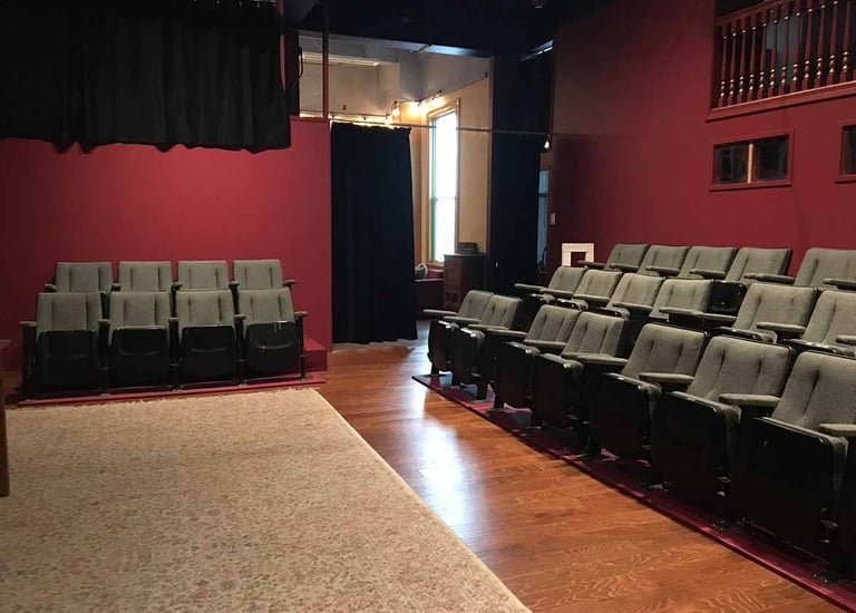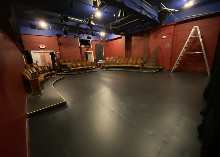 The sixth floor Main Stage theatre includes a thrust stage with unobstructed view from all 49 seats and room for additional seating. Available stage area is 19 feet across and 30 feet deep with 13.5 foot ceiling with entrances from backstage & front of house making arena staging an option. Backstage includes two dressing rooms and a small shop area. There is an inside lobby with concessions bar and inner office area with tech booth above.